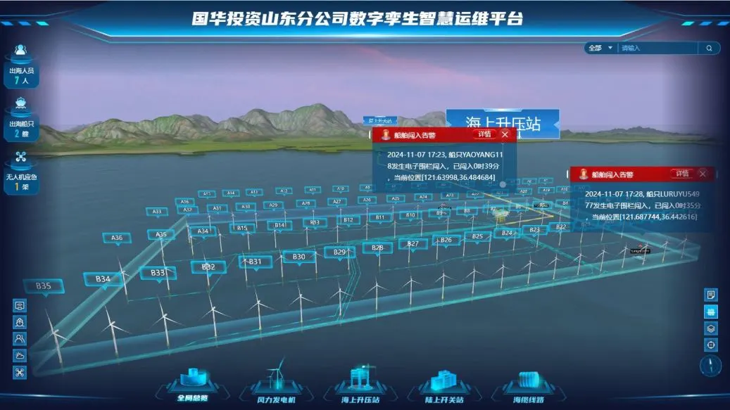 同时,该公司还将场站端各类监测装置和智能设备的全量数据接入了自主研发的海上风电数字孪生智慧监管平台,该平台利用BIM、GIS、数字孪生、云计算、物联网等技术手段,以海上风电数字孪生全生命周期模型应用为核心,集中数据模型展示、安全管理、在线监测、全局监视、通航安全、海上风电建设和海上运维智能化巡检等一系列服务应用,打造了全场景多融合的海上风电智慧监管平台,形成了国华投资山东分公司海上风电一体化调度指挥的管理新模式。该平台的研究成果此前已被中电联鉴定为达到国际领先水平,并获得了山东省电力行业协会电力创新奖一等奖。